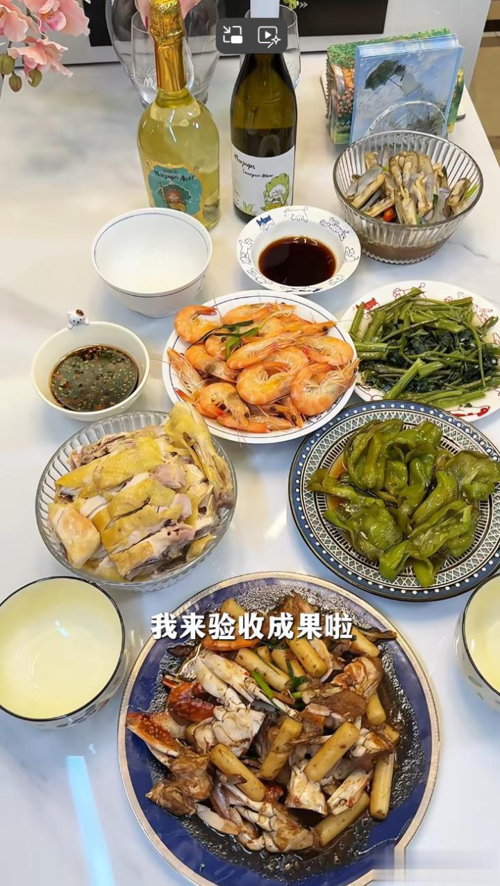 等陈紫函回房间换好衣服再回来,一桌大餐就做好了,鸡肉海鲜应有尽有,还搭配有蔬菜,一共七个菜,戴向宇还细心的调了两种料汁,一份辣的一份不辣的很是细心,旁边还摆好了两瓶香槟酒。