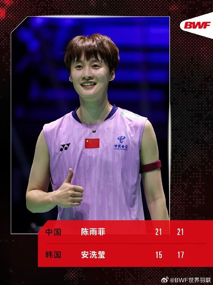 比赛开始后,陈雨菲进攻非常主动,全力攻击安洗莹的反手,而对方则用高远球控制节奏。第一局陈雨菲一直处于比分上的领先,最终以21比15先声夺人。